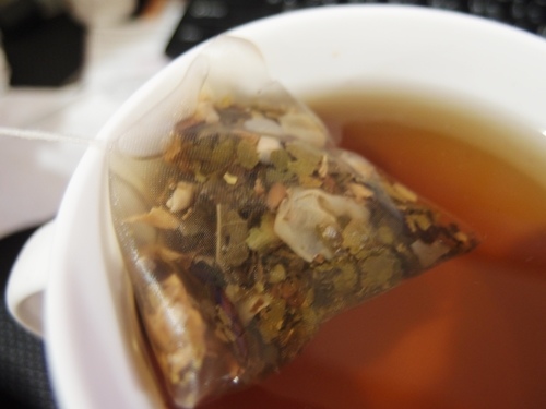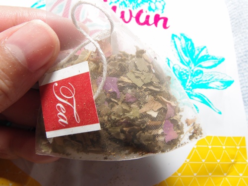 熱泡的建議沖泡方式是加入250~300cc的熱水,浸泡約1.5~2分鐘取出(茶包可再回沖),時間1分鐘後的茶湯是清澄透亮的。但由於我實在是 太懶了,直接以500~600cc的熱水沖了一瓶纖盈茶,浸泡時間較久一點,雖然顏色較深,但即使是浸泡較久的時間,纖盈茶卻是甘甜不苦澀,聞起來是淡淡 的香味,入口的香氣還是帶有點玫瑰味。