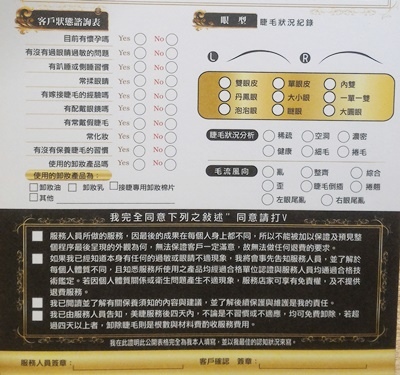 先填寫一份客戶資料及諮詢表,其實美睫師已經先將問題都先問過了,基本上我只要填寫基本資料即可!