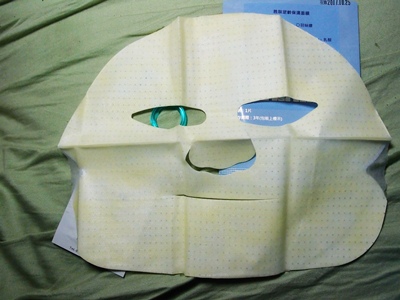 先將白色的塑膠膜撕除,再將中間的京純棉面膜包覆住全臉,再將最外層的黃色紙膜撕除。