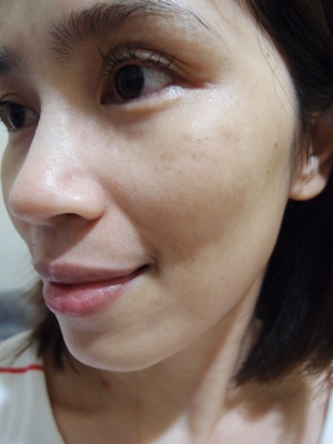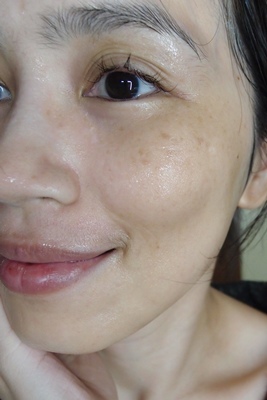 在敷著珍珠精華嫩白面膜前的臉實在是太乾燥了,吸附著滿滿精華液的面膜在敷了十五分鐘後取下,面膜紙感覺已經很乾了,但臉上只有一點點的精華液,輕拍全臉後的樣子,臉上除了保濕度大大增加外,肌膚也變得更水嫩透亮許多。