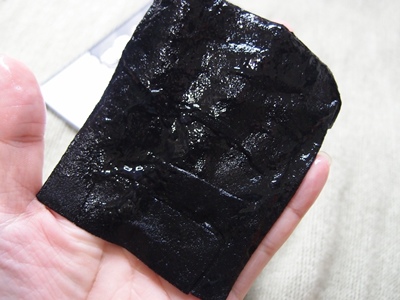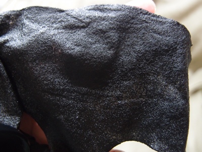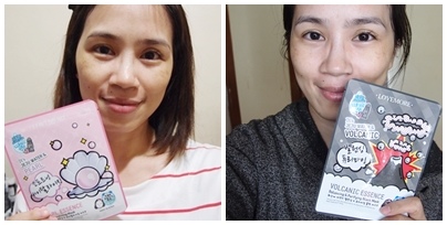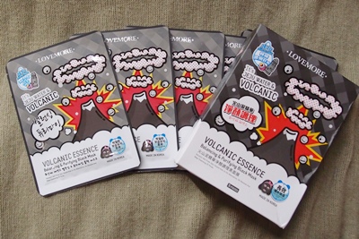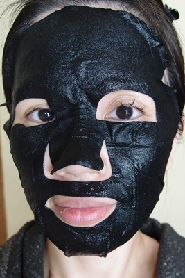 取出的火山泥精華淨顏調理黑面膜,原以為會是黑色的泥狀精華,結果是面膜紙本身是黑的,但精華液則是濃稠狀,吸附了飽飽的精華液,攤平後敷在臉上。