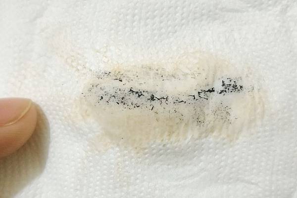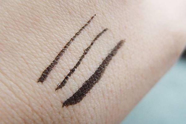 在手背上試畫,細的線條及粗線條都能很容易的畫出來,線條也不會有暈開的效果,畫完立即以指腹擦試,速乾的效果極佳。