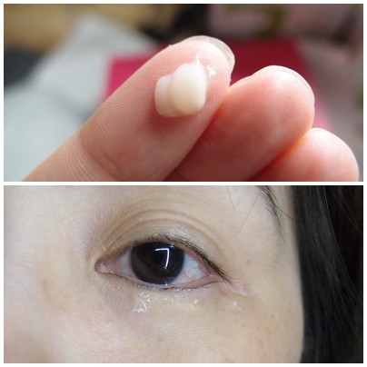 接著就是保持面無情,等抗皺霜乾燥,大約2分鐘改善眼袋。塗抹的部位感覺像是塗抹了膠水一般,薄薄的一層,臉上肌膚會覺得有點繃繃緊緊的,這時也不敢有大動作,就深怕會有細紋跑出來。